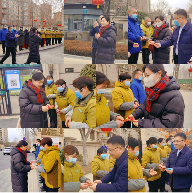 2023 年 1 月 21 日下午,鴻寶集團總裁袁曉曦前往鴻寶物業所轄園區各項目對春節依然堅守在崗的一線員工進行親切慰問,鴻寶物業總經理鄭偉鵬、總經辦主任王艷棟全程陪同,并送上暖心慰問禮品及彩頭紅包,向大家致以新春的問候及祝福。