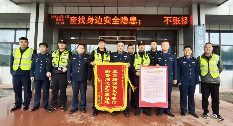 2025 年 10 月 17 日,新鄉(xiāng)市公安局交通管理支隊(duì)大廣高速大隊(duì)主要負(fù)責(zé)同志專程到訪大橋公司,冒雨送來感謝信與錦旗,對公司在本年度防汛搶險及“國慶·中秋”雙節(jié)保通工作中的突出貢獻(xiàn)予以書面表彰。此次致謝不僅是對大橋公司在防汛關(guān)鍵期、國慶中秋雙節(jié)保通任務(wù)中專業(yè)擔(dān)當(dāng)?shù)母叨瓤隙ǎ蔑@了警企攜手守護(hù)道路安全的堅實(shí)成果,為雙方深化合作注入新動力。